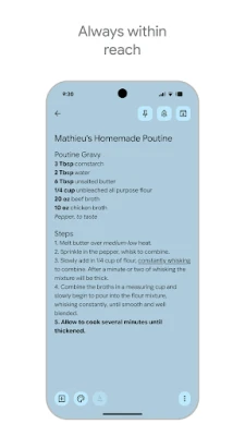 Без обзира да ли сте на телефону, таблету, рачунару или користите Wear OS, Google Keep осигурава да су ваше белешке увек ажурне и доступне. Све што додате аутоматски се синхронизује на свим вашим уређајима, нудећи вам неприметно искуство где год да се налазите. Искористите предности паметних подсетника који се активирају на основу времена или локације – на пример, добијте подсетник за списак за куповину чим стигнете у продавницу. Google Keep је дизајниран да вам пружи праву информацију у правом тренутку, чинећи ваш живот организованијим и продуктивнијим.