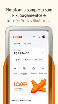 Inter se ne zaustavlja samo na tradicionalnim finansijskim uslugama. Mislili smo i na budućnost vaše porodice, nudeći besplatne digitalne račune za mlađe od 18 godina – "Inter Kids" za planiranje i "Inter You" za učenje samostalnog upravljanja novcem. Sakupljajte bodove kroz besplatan program "Inter Loop" i menjajte ih za milje, popuste, dodatni povrat novca u Inter Shop-u, pa čak i za investicije. Pronađite idealno rešenje za finansiranje uz raznovrsne kredite i personalizovanu podršku. U Inter Shop-u vas čekaju ekskluzivni popusti i povrat novca pri kupovini u najboljim prodavnicama. Zaštitite ono što vam je najvažnije uz sveobuhvatnu platformu osiguranja. A uz Inter Cel, uživajte u najširoj pokrivenosti mobilnog interneta u Brazilu, neograničenim pozivima i bonusima, uz povrat novca direktno na vaš račun. Inter donosi bankarstvo, posredništvo i mnoge druge servise, uključujući alat za kontrolu budžeta "Kompas" i "Inter Putovanja" za planiranje putovanja, sve u jednoj aplikaciji. Dođite i pojednostavite svoj život sa Interom!