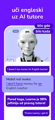 Govorite engleski, španski i francuski sa samopouzdanjem uz Learna: Engleski i španski. Ova AI aplikacija nudi interaktivne lekcije gramatike, izgovora i razgovora. Vaš lični AI tutor vodi vas kroz zabavno i personalizovano učenje jezika, od početnika do naprednog nivoa.